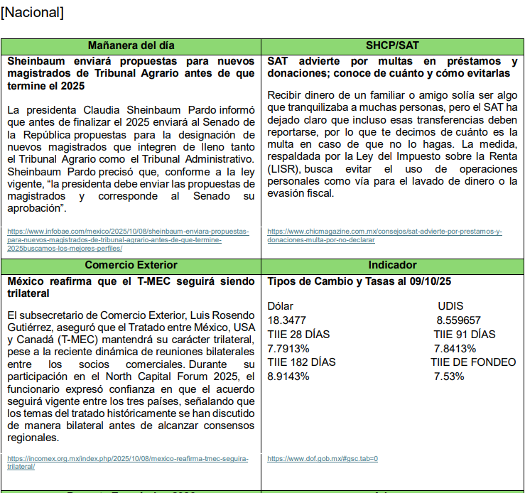 Noticias del día Jueves 09.10.2025 Versión Español.